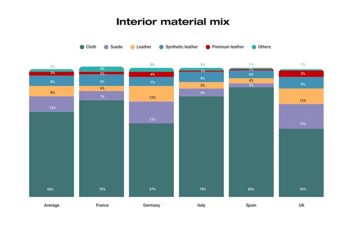 Tuo tarpu Pietų Europoje vaizdas visiškai kitoks. Ispanijoje net 85 proc., o Italijoje ir Prancūzijoje – 75 proc. pirkėjų pasilieka standartines medžiagines sėdynes.