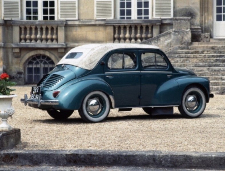 Pirmieji metai po karo „Renault“ buvo ypač sunkūs. 1944 m. vyko sugriautų gamybos linijų rekonstrukcija. Trūko medžiagų, todėl automobilio kėbului naudotas aliuminis buvo pakeistas plienu. Dėl dažų trūkumo pirmieji modeliai buvo nudažyti pusiau matine smėlio spalva „Crème 314“, kurią naudojo Vokietijos kariuomenė. Automobilis gavo neoficialią, bet populiarią pravardę „motte de beurre“ (liet. gabalėlis sviesto). Be to, ankstyvieji modeliai išsiskyrė raudonas ratlankiais. Lefaucheuxas siūlė, kad naujasis „Renault“ būtų pavadintas „Régiquatre“ ir sietųsi su prieškariniais modeliais. Taip pat siūlyti „Régine“ ir „Réginette“ pavadinimai. Tačiau pasitarus su komanda, buvo pasirinktas „4 CV“ vardas, kuris reiškė variklio darbinį tūrį (1 CV – maždaug 190 cm3).