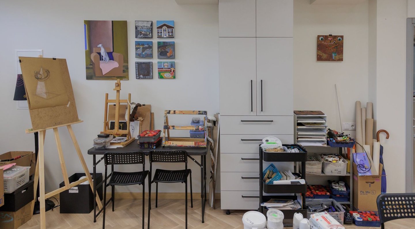 Dar vienas sprendimo pareikalavęs studijos ypatumas – įvairaus dydžio ir paskirties kūrybos priemonių gausa – nuo akvarelių, guašo ir akrilinių dažų iki teptukų, pieštukų ir flomasterių.