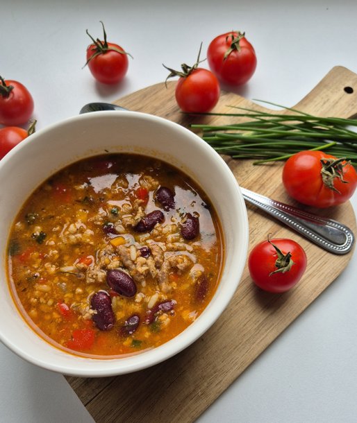 Daržoves nulupame, nuplauname. Svogūną, porą, česnaką, čili supjaustome smulkiais gabalėliais, papriką kubeliais, morką griežinėliais. Puode įkaitiname aliejų, sudedame ir pakepiname daržoves.