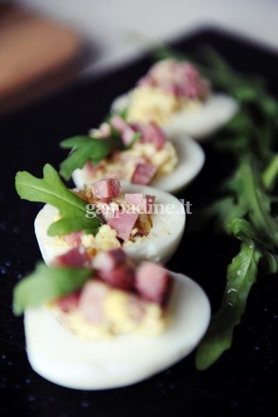 majonezu, paskaniname pipirais. Šia mase įdarome kiaušinius. Kiaušinio
