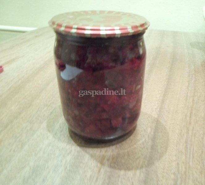 - Marinatą pagaminkite iš visų produktų, išskyrus burokėlių. Juos išvirtus supjaustykite norimo dydžio kubeliais ir sudėkite į stiklainius. Užpilkite marinatu.