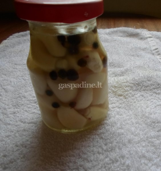 - Supilkite česnakus su marinatu į stiklainius, sandariai uždarykite ir palikite atvėsti.