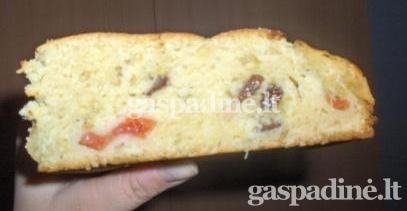 Keturiuose šaukštuose šilto vandens išmaisykite mieles ir 30 min. palaikykite šiltai. Persijotus miltus sumaišykite su cukrumi ir žiupsneliu druskos. Mišinyje padarykite duobelę, į ją supilkite pieną, mieles, sumaišykite ir dar 30 min. palaikykit šiltai. Sviestą sumaišykite su tryniais ir sudėkite į masę. Tešlą maišykite, kol atsiras oro pūslelių (aš maišiau apie 10 min). Tada tešlą uždenkite ir dar šiltai palikite porai valandų. Suberkite į tešlą vaisius, razinas bei tarkuotą citriną ir išmaišykite. Dėkite į riebalais išteptą kepimo skardą ir kepkite 40 - 50 min. 180 laipsnių karštumo orkaitėje. Nors pyrago gaminimas užima nemažai laiko, bet skonis viską atperka. Tiesa - pyragas gaunasi labai didelis. Skanaus.