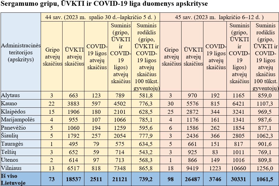Nacionalinės visuomenės sveikatos priežiūros laboratorijos duomenimis, 2023 m. 44-ąją savaitę ŪVKTI simptomus turintiems pacientams iš viso buvo paimti 46 ėminiai, iš kurių 2-uose ėminiuose buvo aptiktas A tipo gripo virusas (A(H1)pdm09) ir 1-ame – respiracinis sincitinis virusas (RSV).