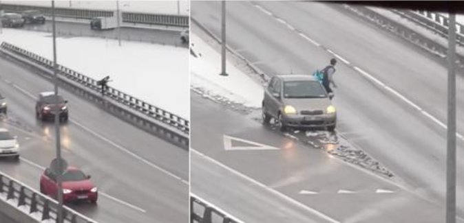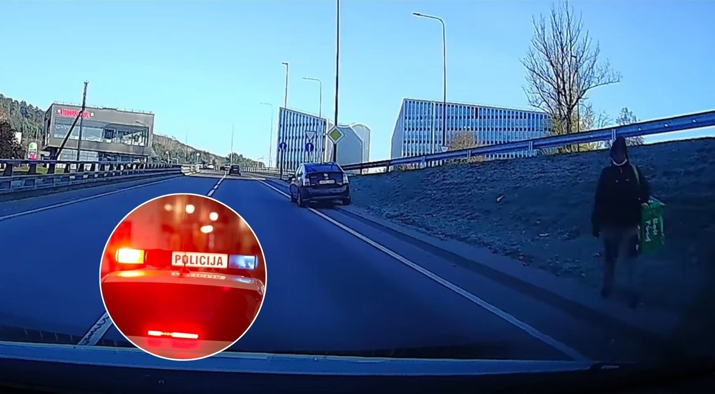 Automobilio vaizdo registratoriumi nufilmuota, kaip „Bolt“ kurjeris, važiuojant viaduku nuo geležinio vilko gatvės ties šeškinės kalnu, viaduko pakraštyje paliko savo automobilį.