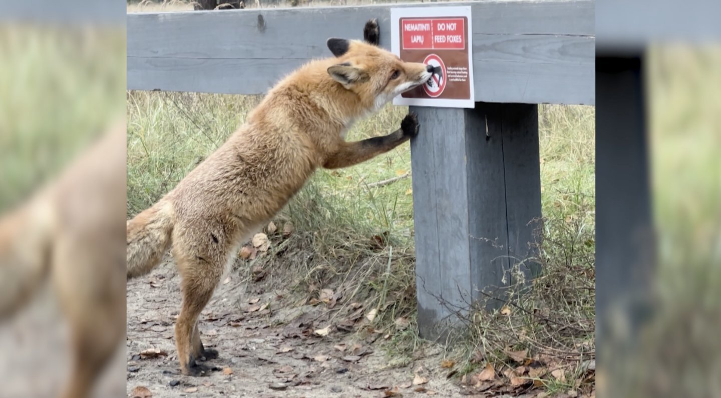 Neringoje, aikštelėje šalia Negyvųjų kopų, šmirinėja lapė. TV3 Žinios nufilmavo, kaip rudauodegė apuosto maitinti lapes draudžiantį ženklą ir tarsi pasipiktinusi tokia neteisybe, bando ženklą dantimis nuplėšti. Vis tik nepavyksta. Tačiau po kiek laiko į šią aikštelę atvykęs Kuršių nerijos nacionalinio parko darbuotojas Stasys ženklą randa besimėtantį ant žemės.