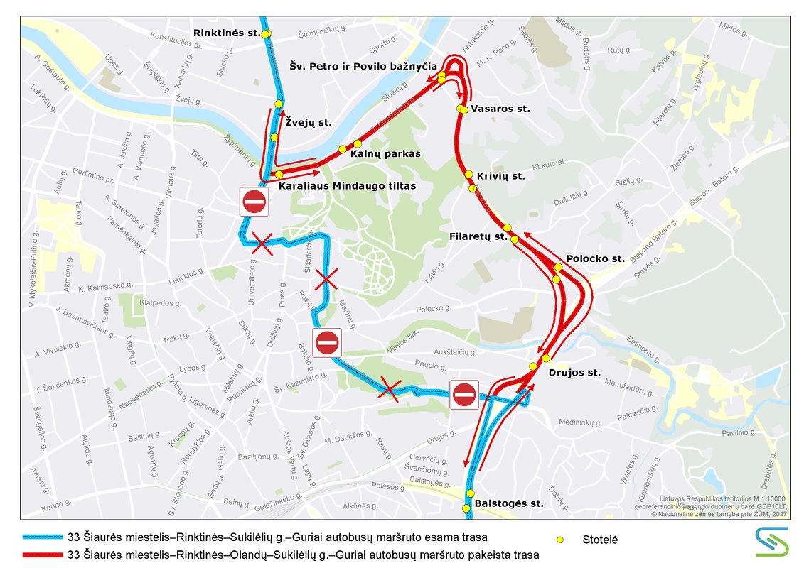 33 Šiaurės miestelis–Rinktinės–Sukilėlių g.–Guriai maršruto autobusai iš Šiaurės miestelio iki Karaliaus Mindaugo tilto kursuos įprasta trasa, toliau suks į T. Kosciuškos gatvę ir važiuos Olandų bei Drujos gatvėmis, o įsukę į Sukilėlių gatvę grįš į įprastą trasą. Tokia pačia trasa autobusai grįš į Šiaurės miestelį.