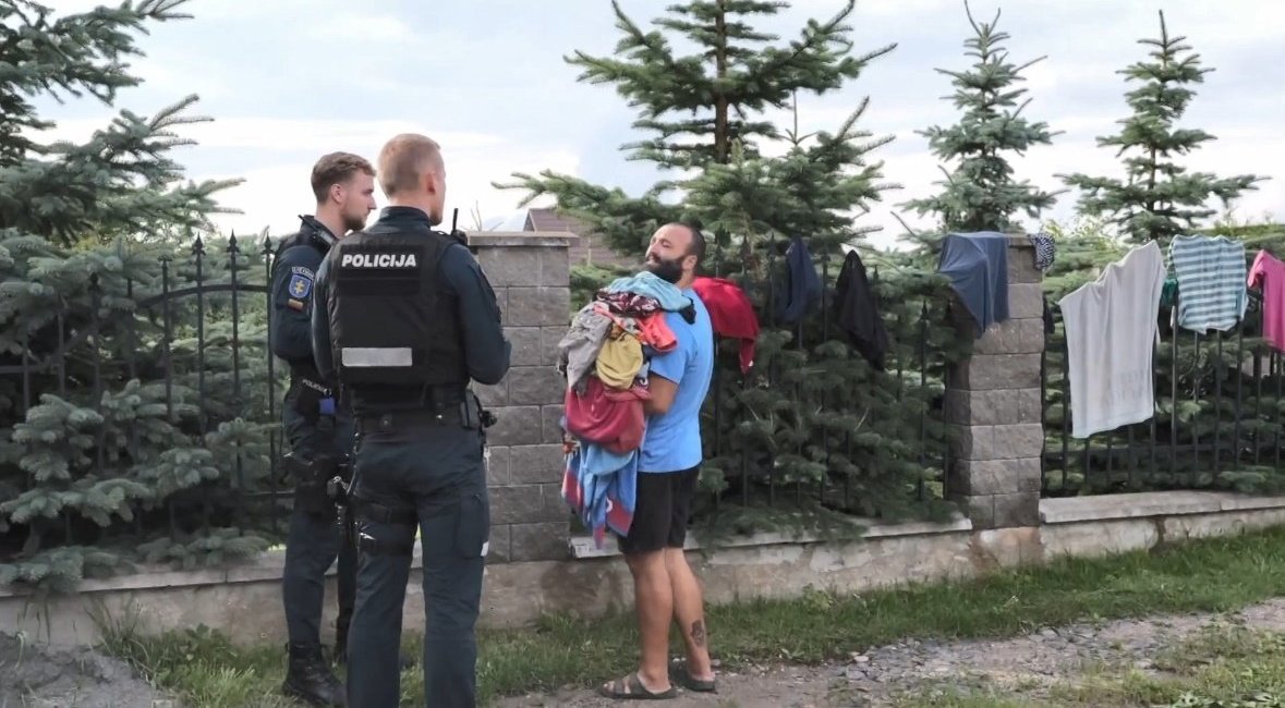 Pareigūnams atvykus į nurodytą vietą Daržininkų kaime, akį patraukė margaspalvė dekoracija – ant tvoros išdžiaustyti drabužiai. Prie vartų pastebimi asmenys su kuprinėmis.