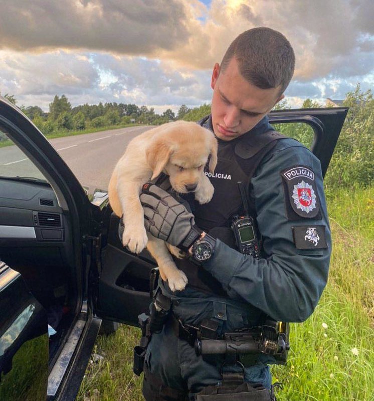 Po nuotrauka, kurioje pareigūnas rankose laiko šuniuką, buvo paliktas toks prierašas: