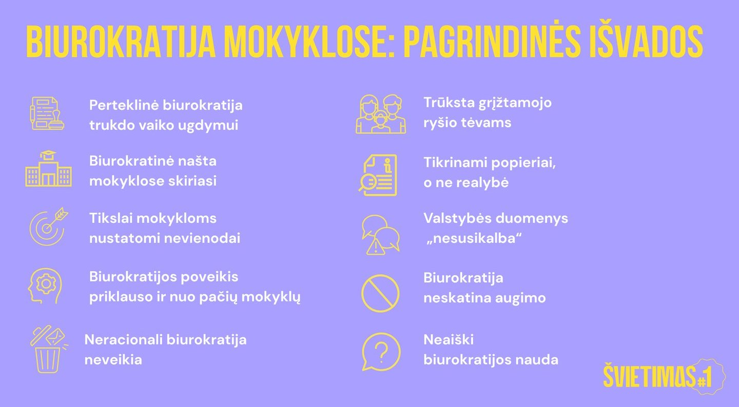 „Mūsų organizacijos tikslas – pasiekti Lietuvos švietimo kokybės šuolį. Tačiau tam būtina, kad mokyklų vadovai ir mokytojai galėtų dirbti laisvai ir kūrybiškai. Deja, šiandien jie mini vis tą pačią problemą: biurokratija slopina iniciatyvą ir kūrybiškumą bei atima laiką, kuris galėtų būti skirtas vaikams. Tad norėjome aiškiai pamatyti, kur ir kaip ši našta susidaro. Tyrimas parodė, kad biurokratija ateina iš skirtingų lygių, nuo savivaldybių iki prižiūrinčių institucijų ir pačių mokyklų, o popieriai Lietuvoje neretai tampa svarbesni už vaiką“, – sako Laura Masiliauskaitė, „Švietimas #1“ vadovė.