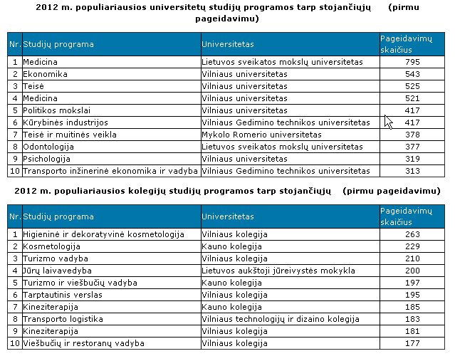Žemiau sąrašas 2012 metų populiariausių universitetų ir kolegijų studijų programų tarp stojančiųjų, kurias jie nurodė pirmu pageidavimu.