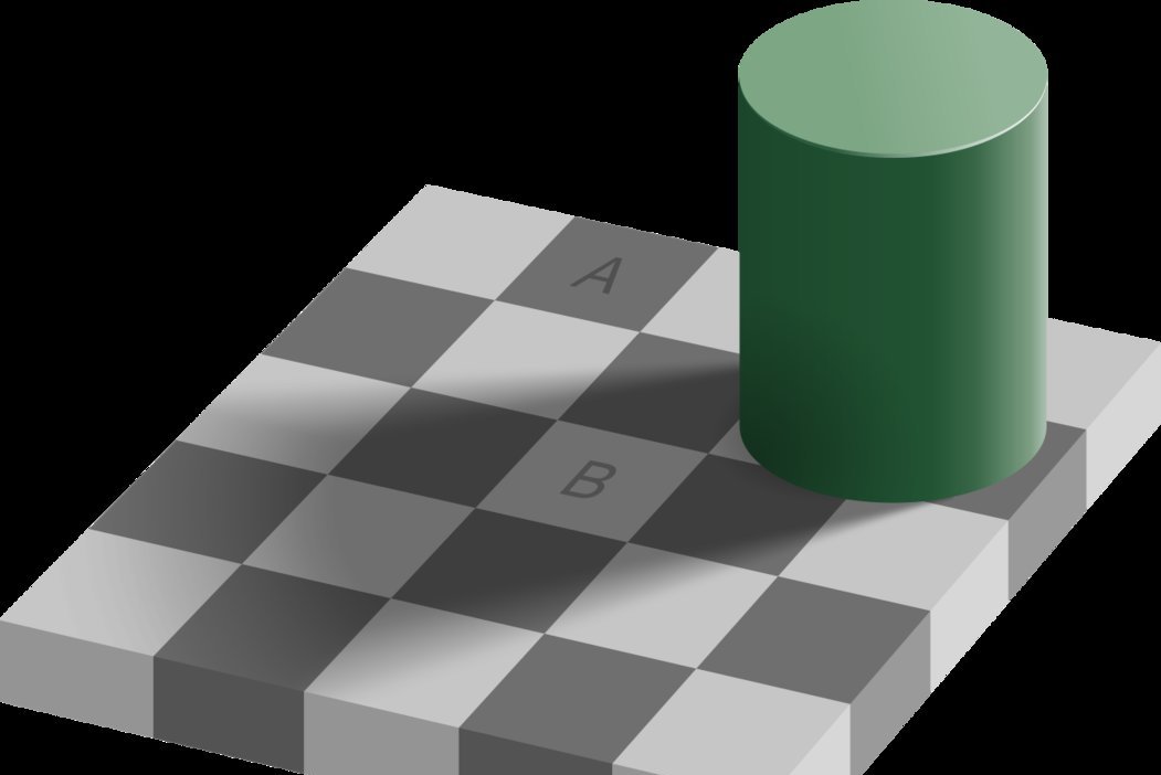 Niekas nežino, kada ši optinė iliuzija buvo sukurta, nes jos versijų – šimtai. Kai kuriose reikia palyginti dvi plytas iš to paties namo sienos, kitose – tiesiog porą skritulių ant kintamo pilko fono. Žinoma, atsakymas visada tas pats – tie kvadratai (plytos, skrituliai) yra vienodos spalvos. Tik mums dėl konteksto atrodo, kad jie yra skirtingi. B supa tamsūs kvadratai, o A – šviesūs – štai ir visas skirtumas.
