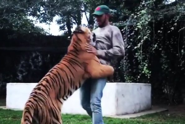 31-rių lenktynininkas žengė žingsnį atgal ir sušuko, o tigrą tikriausiai geriau pažįstantis žmogus sako: „Nesijaudink, atsipalaiduok, viskas gerai.“