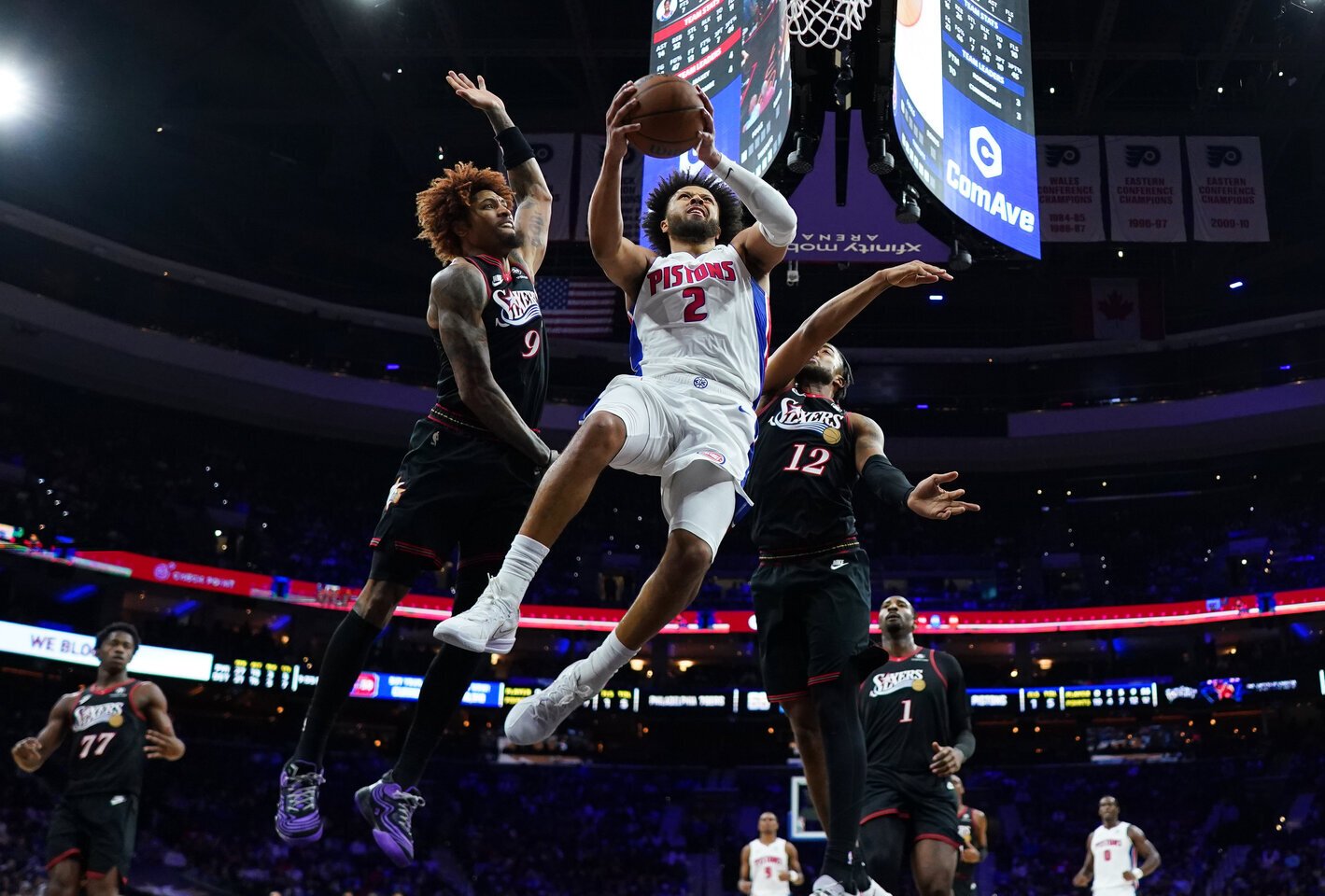 Permainingo mačo pabaigoje Tyrese’as Maxey sumažino skirtumą iki minimalaus (108:109), Cade’as Cunninghamas į tai atsakė dvitaškiu likus 11 sekundžių.