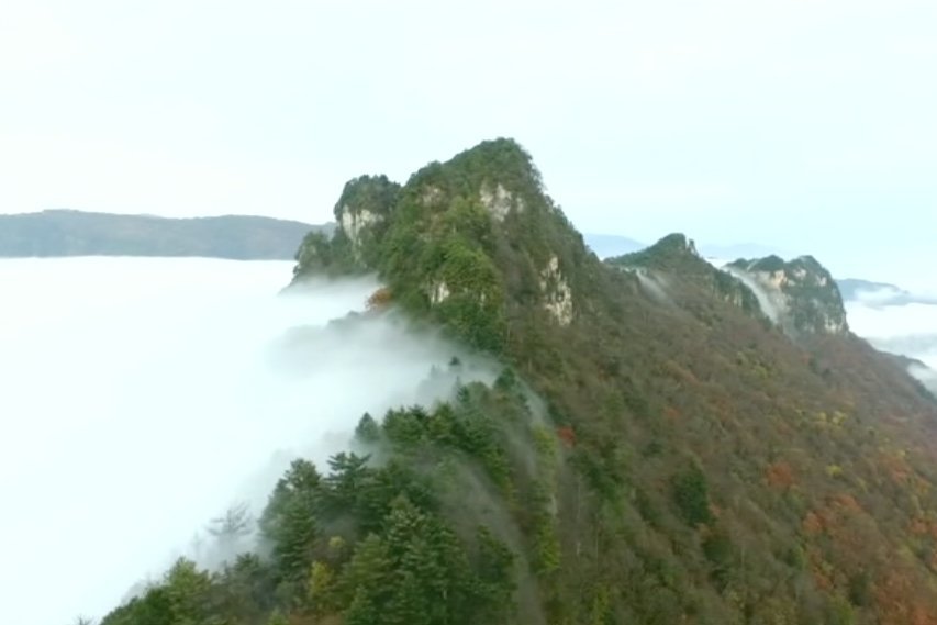 Tik mažos debesų juostos tingiai leidžiasi rudeniškomis spalvomis pasipuošusių medžių viršūnėmis kalnais, kurie vietomis siekia ir dviejų su puse kilometrų aukštį. Vietiniai gyventojai pasakoja, jog debesys šiuos kalnus užkloja dažnai, tačiau toks į krioklio tekėjimą panašus vaizdas yra itin retas. Neveltui šis Hubėjaus provincijoje esantis regionas 2016 metais buvo paskelbtas viena iš saugojamų UNESCO pasaulio paveldo vietų.