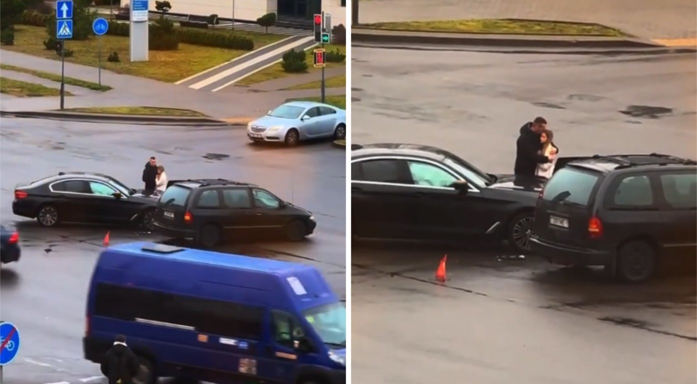 Sprendžiant iš vaizdo įrašo, susidūrė du lengvieji automobiliai,o šalia jų stovi automobilių vairuotojai. Socialinių tinklų vartotojai atkreipė dėmesį į du jaunuolius – vaikiną ir merginą, – kurie vietoj ginčų ir keiksmažodžių švelniai apkabino vienas kitą.