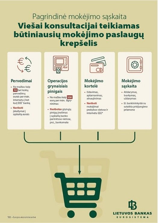 Nuo 2017 m. vasario 1 d. gyventojai bankuose ir kredito unijose galės turėti pagrindinę mokėjimo sąskaitą su tokiu krepšeliu, todėl mokėjimo paslaugos taps labiau prieinamos gyventojams.