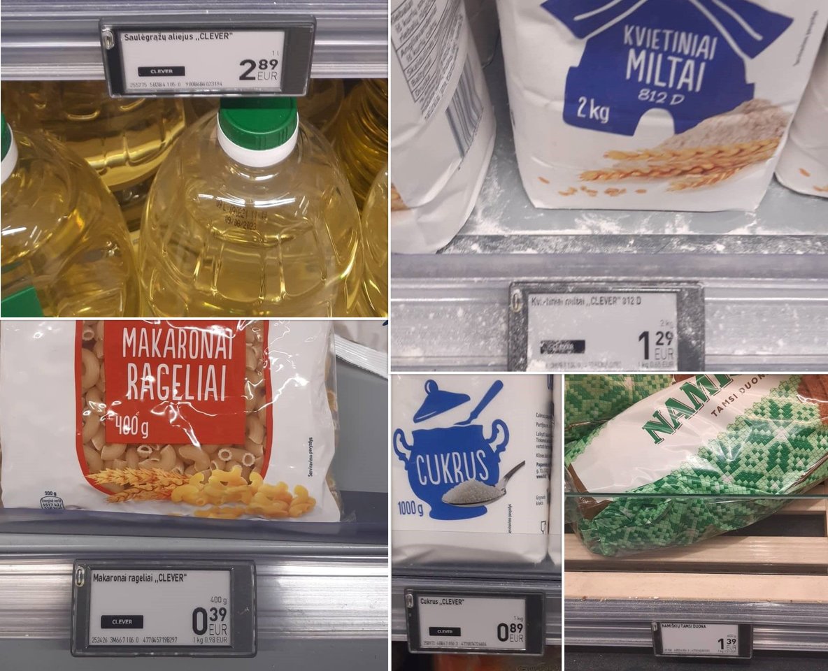 Toliau kainas patikrinau prekybos tinkle „Norfa“. Čia 800 g ryžių kainavo 0,79 euro, olandiško sūrio 200 g – 1,43 euro, 180 g sviesto – 1,49 euro, 180 g varškės – 0,61 euro, O,9 l pieno – 0,63 euro, 2 kg kvietinių miltų 1,29 euro, 400 g. makaronų – 0,39 euro, 1 kg cukraus – 0,89 euro, 1 l saulėgrąžų aliejaus 2,69 euro, 700 g duonos – 0,65 euro.