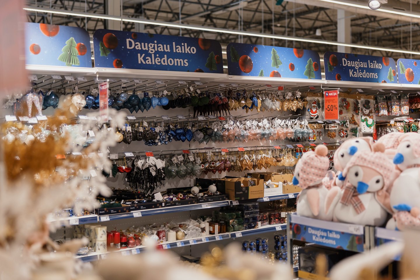 Pasirūpinti pigiau visais kalėdiniais žaisliukais, girliandomis ir dekoracijomis, pirkėjai galės pasinaudodami ir šios kategorijos 50 proc. nuolaida, kada prekių įsigyjama daugiau nei dvi. Dar didesnė nuolaida – 60 proc. – bus suteikiama dirbtinėms Kalėdų eglutėms.
