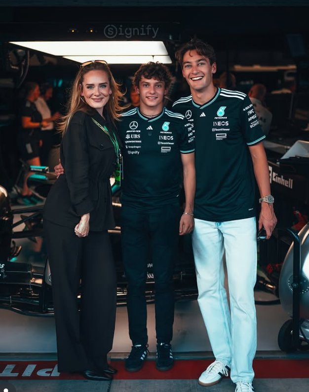 37-erių dainininkė pasirodė „Mercedes AMG Formula One“ komandos garaže, kur šypsojosi kartu su lenktynininkais George’u Russellu ir Kimi Antonelli. Juodu marškiniu kostiumu pasipuošusi Adele pademonstravo lieknesnę figūrą ir akivaizdų svorio pokytį.