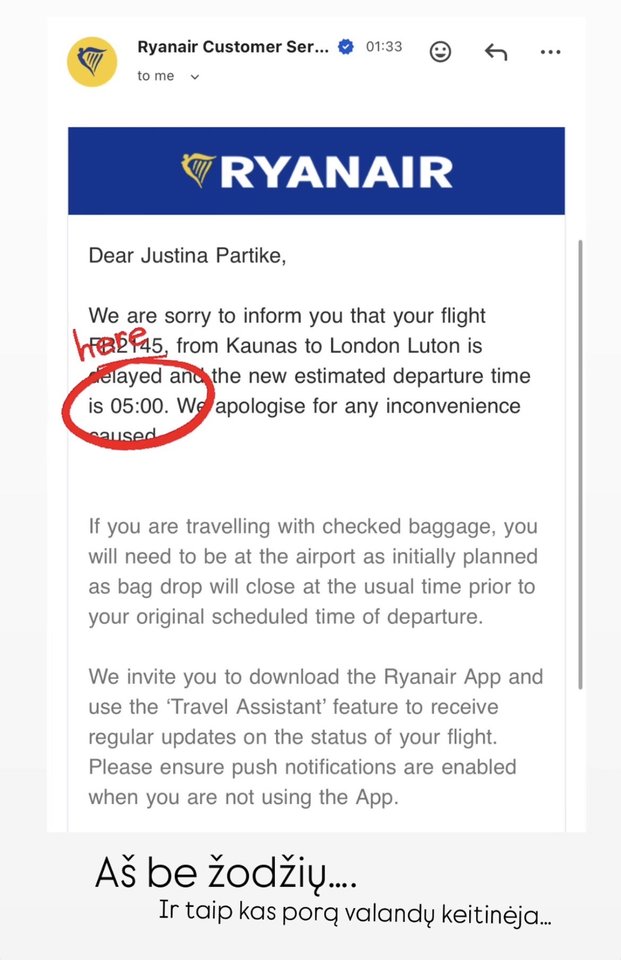 Vėliau Justina pranešė, kad jos skrydis buvo perkeltas į kitą dieną: