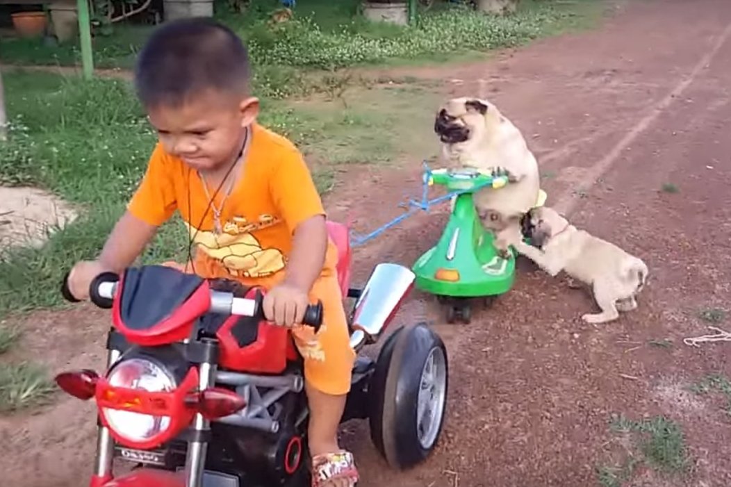 Istorija labai paprasta: du mopsai – vienas labai didelis, kitas labai mažas – gavo progą pasivažinėti motociklu. Džiaugsmas didelis, tačiau mažasis vis krenta, bet pasiduoti neketina. Vis bando, bando užlipti atgal, o toliau važiuojančią transporto priemonę stabdo savo mielu lojimu.
