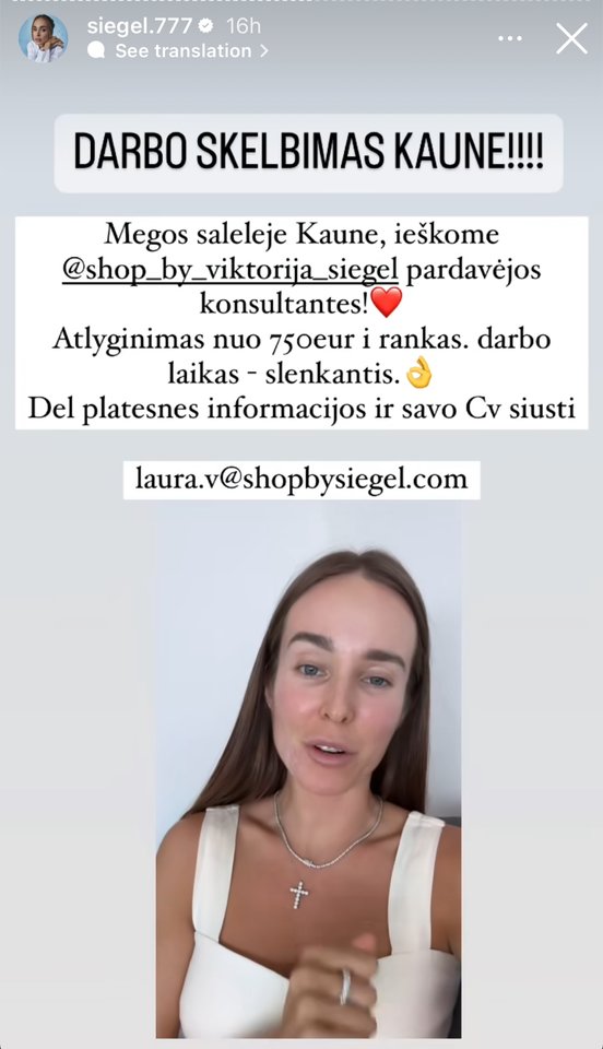 Socialiniame tinke „Instagram“ pasidalijusi darbo skelbimu, V. Siegel atskleidė, kad ieško konsultantės-pardavėjos, galinčios dirbti verslininkės parduotuvės „Shop by Siegel“ salelėje.